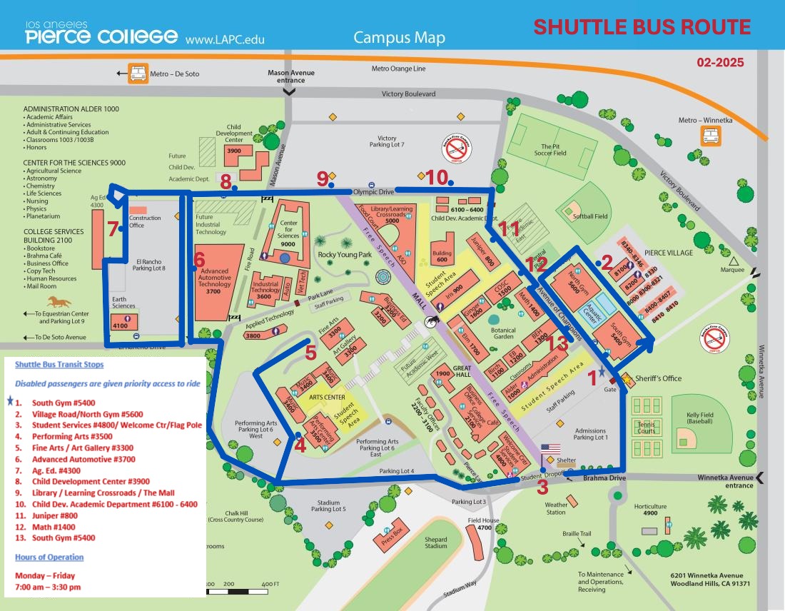 Los Angeles Pierce College Shuttle Bus Route Map - L.A. Pierce College operates a shuttle bus around campus to assist students, staff and visitors in traveling to their destination. Please see the map for shuttle bus stop locations.